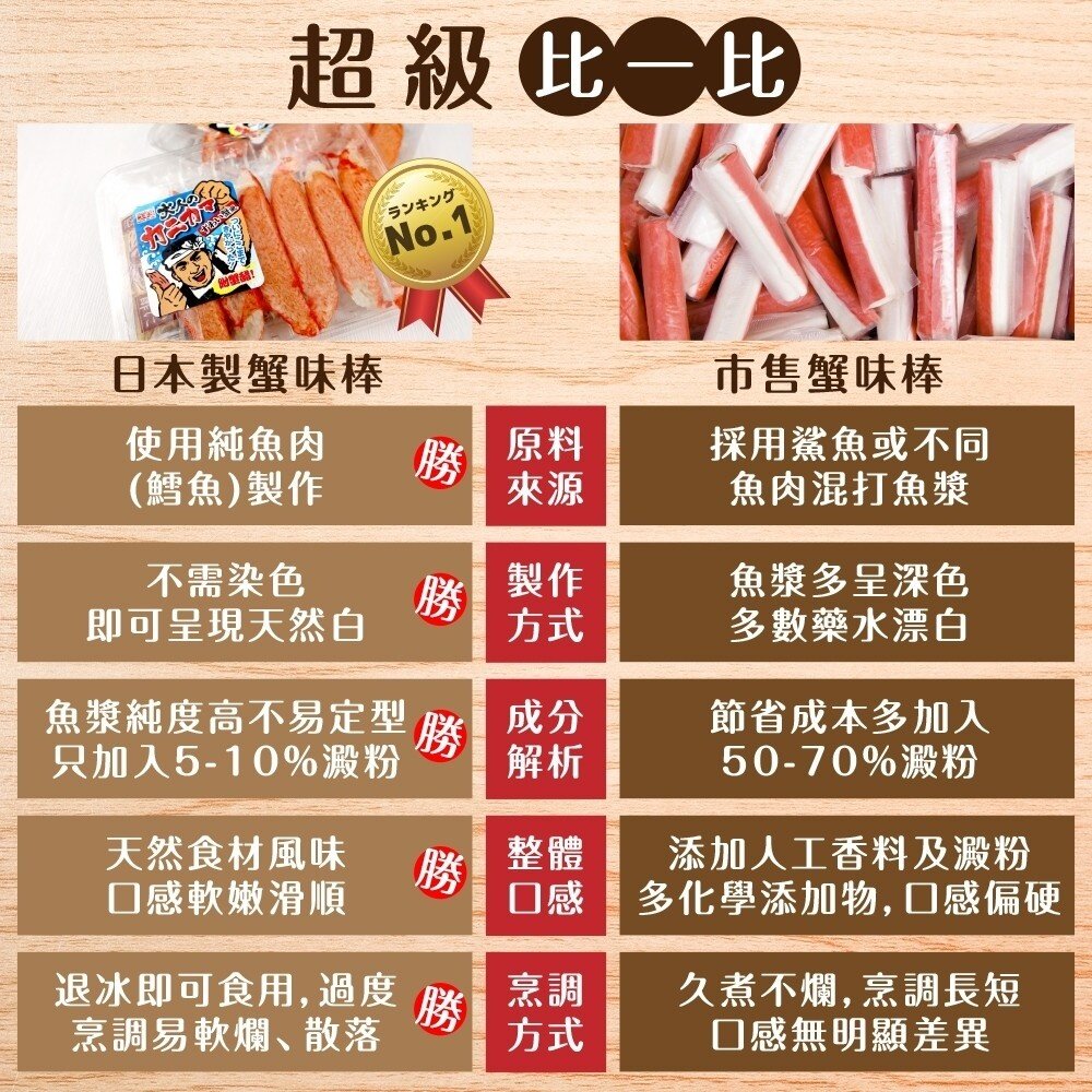 蟹味棒-魚肉(鱈魚)、雞蛋白、澱粉(小麥、馬鈴薯、玉米)、螃蟹提取液、食鹽、發酵調味料(水、米、米麴、食鹽)、雞蛋、大豆油、L-麩酸鈉、樹薯澱粉、海藻糖、食用色素(番茄色素、紅椒色素)、香料