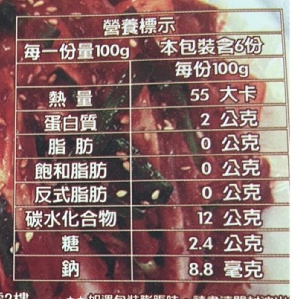 成份:大白菜、辣椒、韓國辣粉、鹽、糖/水果、魚露、蔥、薑、蒜、調味料