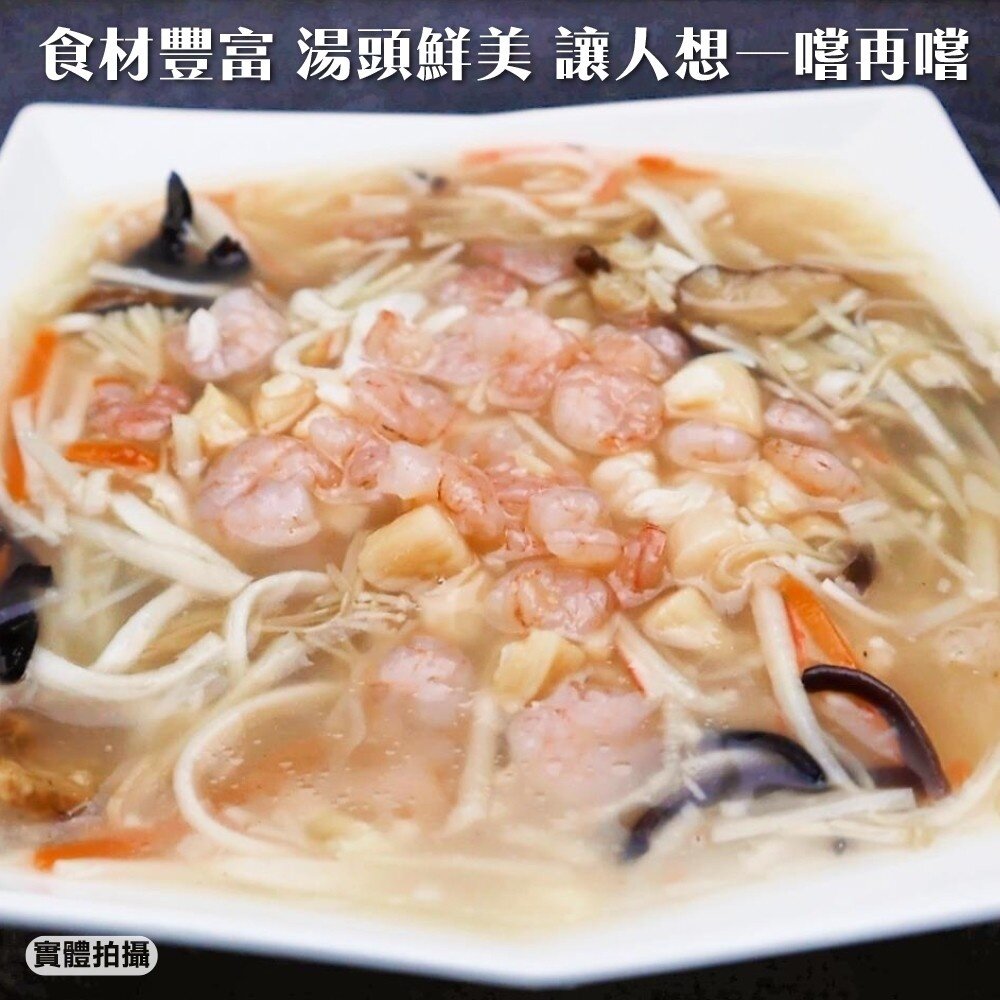 成分:大白菜、脆筍絲、蟹肉絲、金針菇、胡蘿蔔絲、豬肉絲、香菇絲、木耳絲、蝦仁、小珠貝、紅蔥油、扁魚、醬油(水、非基因改造黃豆(高蛋白豆片)、小麥、食鹽、酒精)、糖、食鹽、白胡椒粉、水、雞肉粉、洋蔥粉、調味劑(L-麩酸鈉)