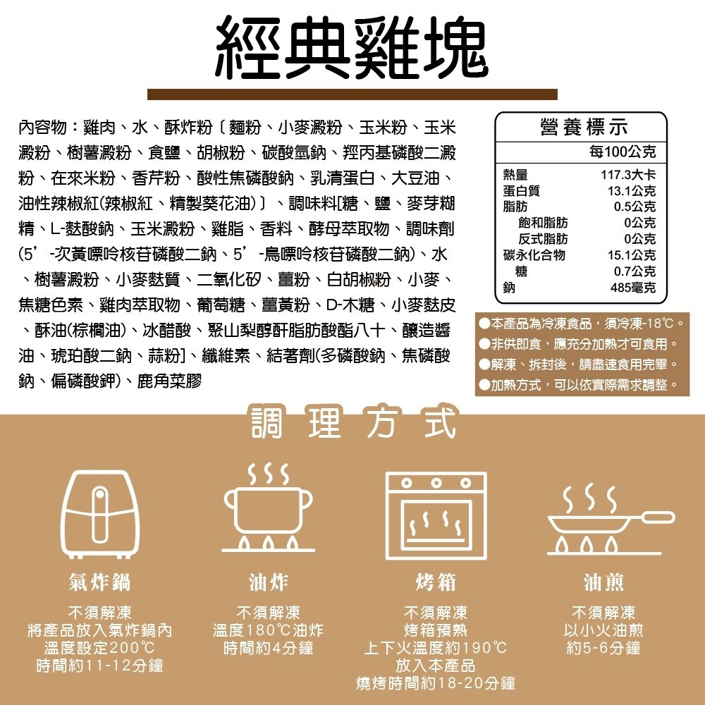 成分:雞肉、水、酥炸粉〔麵粉、小麥澱粉、玉米粉、玉米澱粉、樹薯澱粉、食鹽、胡椒粉、碳酸氫鈉、羥丙基磷酸二澱粉、在來米粉、香芹粉、酸性焦磷酸鈉、乳清蛋白、大豆油、油性辣椒紅(辣椒紅、精製葵花油)〕、調味料[糖、鹽、麥芽糊精、L-麩酸鈉、玉米澱粉、雞脂、香料、酵母萃取物、調味劑(5’-次黃嘌呤核苷酸磷酸二鈉、5’-次鳥嘌呤核苷酸磷酸二鈉)、水、樹薯澱粉、小麥麩質、二氧化矽、薑粉、白胡椒粉、小麥、焦糖色素、雞肉萃取物、葡萄糖、薑黃粉、D-木糖、小麥麩皮、酥油(棕櫚油)、冰醋酸、聚山梨醇酐脂肪酸酯八十、釀造醬油、琥珀酸二鈉、蒜粉]、纖維素、接著劑(多磷酸鈉、焦磷酸鈉、偏磷酸鉀)、鹿角菜膠