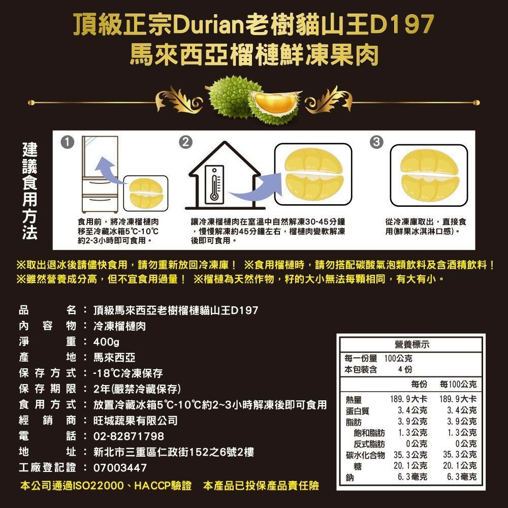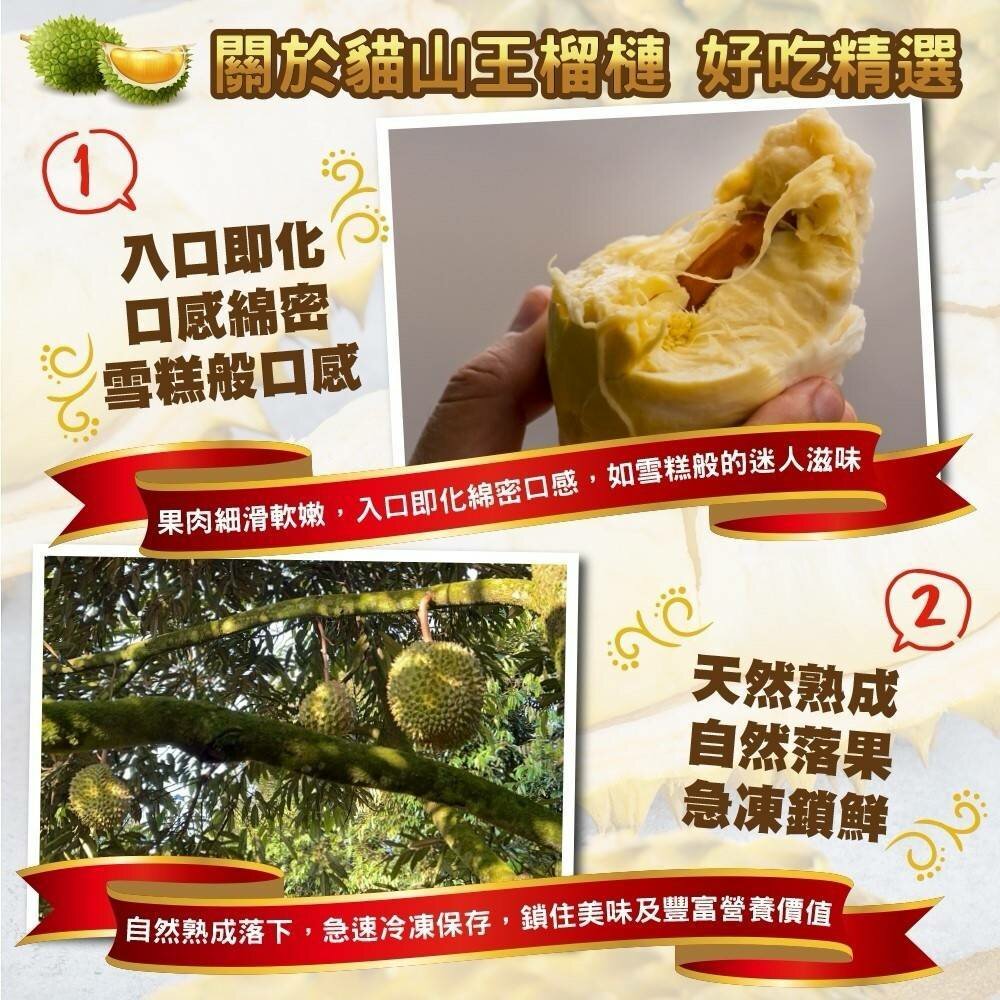 本產品為去殼含籽冷凍「貓山王」榴槤果肉