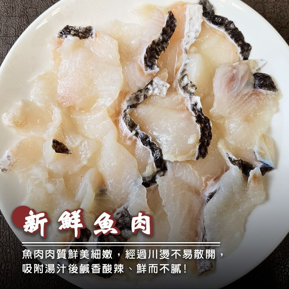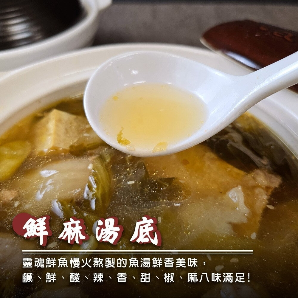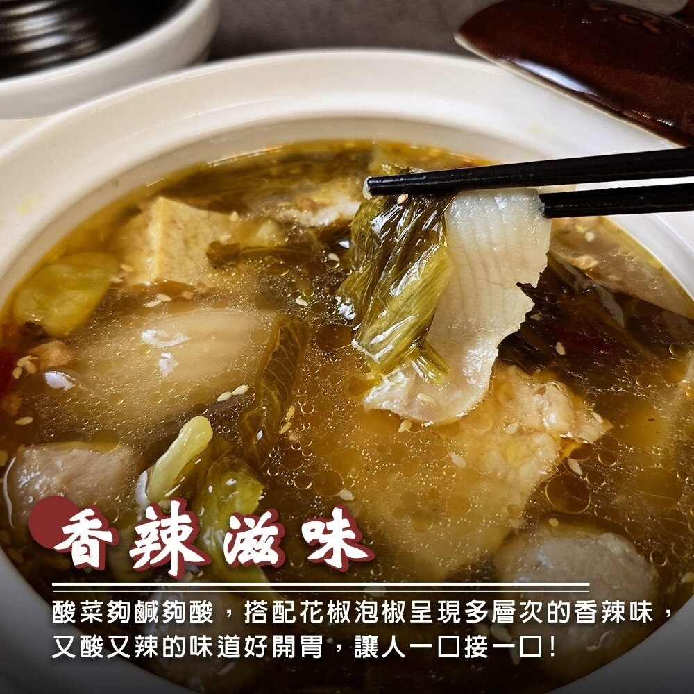 成分:水、烏鱧魚片、酸菜、花椒油、凍豆腐、泡椒【水、辣椒、食用鹽、冰醋酸、檸檬酸、己二烯酸鉀】、小貢丸【猪肉(台灣)、高湯(水、貢丸)、蔗糖、小麥蛋白、食鹽、大豆油、芝麻油、蒜頭、白胡椒粉】、寬粉、豆皮、蒜粗、薑末、大骨粉【鹽、調味劑(L-麩酸鈉、胺基乙酸、琥珀酸二鈉、5'-次黃嘌呤核苷磷酸二鈉、5'-鳥嘌呤核苷磷酸二鈉)、麥芽糊精、糖、豬肉粉〔乳糖、醬油粉、植物水解蛋白(大豆、玉米、小麥)、DL-胺基丙酸、精製芥花油、豬肉抽出物、葡萄糖、D-木糖〕、洋蔥粉、品質改良劑(二氧化矽)、香料、甘草、薑母、當歸(調味用)、白胡椒】、蔥段、鹽、乾辣椒、醋精【水、冰醋酸(食品級酸度40%)】、芝麻。