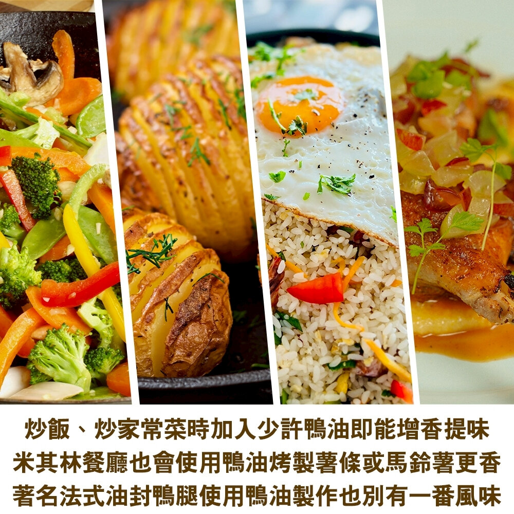 天然鴨油香,可以用來煎、煮、炒、炸、拌飯、拌麵、拌菜!