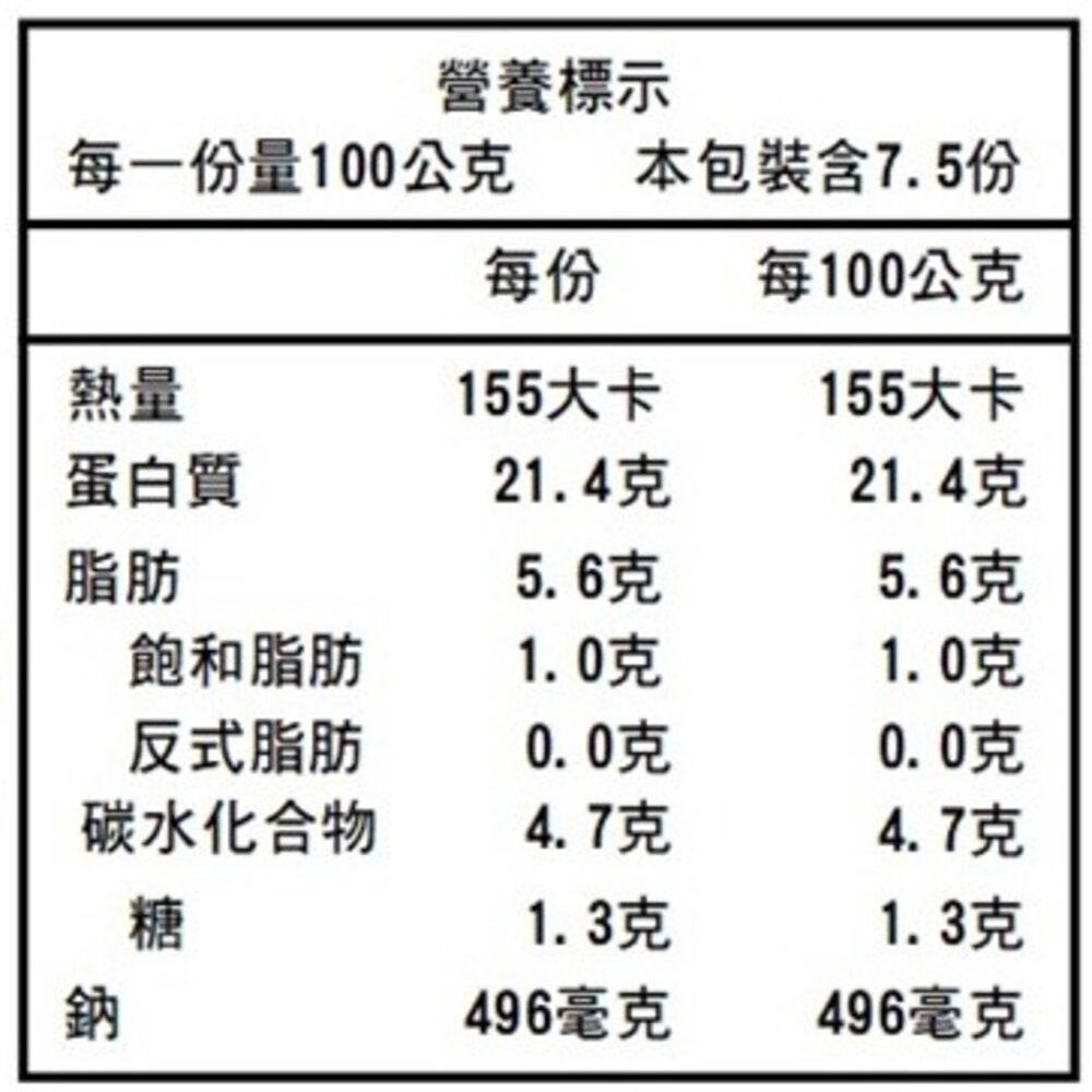 成分:樹薯澱粉、精製魚漿、分離大豆蛋白、棕櫚油、蒜頭、食鹽、已二烯酸、醋磺內酯鉀、多磷酸鈉、焦磷酸鈉(無水)、糖、檸檬酸鈉、甘草酸-銨、多丙烯酸鈉、羧甲纖維素鈉