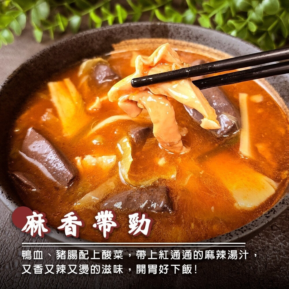 成分:鴨血【水、鴨血、鹽、多磷酸納、酸性焦磷酸鈉、矽樹脂、聚山梨醇酐脂肪酸酯六十五、羧甲基纖維素鈉】、豬腸(美國、英國】、酸菜【芥菜、甘藍菜、鹽、檸檬酸、苯甲酸鈉(防腐劑)、偏亞硫酸氫鈉(漂白劑)、低亞硫酸納(漂白劑)、食用黃色4號】、筍片【麻竹筍、糖】、辣椒醬【辣椒、鹽、精製糖、苯甲酸1.0g/kg(防腐劑)、醋磺內酯鉀(甜味劑)、檸檬酸、檸檬酸鈉、甘草萃(甜味劑)、L-麩酸鈉(胺基乙酸、L-天門冬酸鈉、5'-次黃嘌呤核苷磷酸二鈉、5'-鳥嘌呤核苷磷酸二鈉、DL-胺基丙酸、琥珀酸二鈉、乙烯二胺四醋酸二鈉(抗氧化劑)、多磷酸鈉、關華豆膠】、辣油【大豆油、辣椒粉、辣椒干】、藤椒雞汁【水、鹽、L-麩酸鈉、香料、糖、乙醯化己二酸二澱粉、雞骨肉萃取物(雞骨肉、食鹽、水)、雞脂、酵母萃取物、藤椒油樹脂、5'-次黃嘌呤核苷磷酸二鈉、5'-鳥嘌呤核苷磷酸二鈉、王米糖膠、脂肪酸甘油酯、β-胡蘿蔔素、焦糖色素)、蒜苗、金蘭甲等醬油、蒜頭、米酒(米、蔗糖)、馬鈴薯粉、香油(芝麻油、大豆油)、花椒。