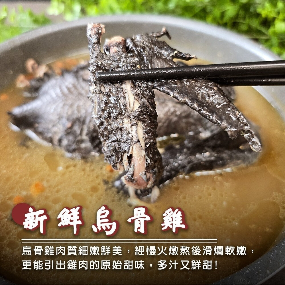 成分:烏骨雞、枸杞、紅棗、大骨粉【鹽、調味劑(L-麩酸鈉、胺基乙酸、琥珀酸二鈉、5'-次黃嘌呤核苷磷酸二鈉、5'-鳥嘌呤核苷磷酸二鈉)、麥芽糊精、糖、豬肉粉〔乳糖、醬油粉、植物水解蛋白(大豆、玉米、小麥)、DL-胺基丙酸、精製芥花油、豬肉抽出物、葡萄糖、D-木糖〕、洋蔥粉、品質改良劑(二氧化矽)、香料、甘草、薑母、當歸(調味用)、白胡椒】、鹽、雞粉【鹽、調味劑(L-麩酸鈉、胺基乙酸、琥珀酸二鈉、5'-次黃嘌呤核苷磷酸二鈉、5'-鳥嘌呤核苷磷酸二鈉)、糖、麥芽糊精、雞肉粉〔含雞肉、DL-胺基丙酸、抗氧化劑(維生素E)〕、雞油〔(含迷迭香抽出物)、木糖酵母粉、洋蔥粉、品質改良劑(二氧化矽)、香料(素食不宜)〕】、人蔘鬚、當歸、川芎
