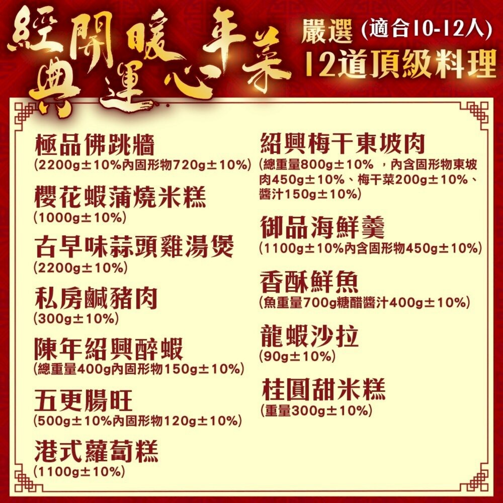 排骨酥【豬排骨(台灣)、大豆分離蛋白、蕃薯粉、糖、食鹽、醬油、麥芽糊精、乾酪素鈉、多磷酸鈉、焦磷酸鈉(無水)、L-麩酸鈉、DL-胺基丙酸、5'次黃嘌呤核苷磷酸二鈉、5'鳥嘌呤核苷磷酸二鈉、琥珀酸二鈉、香辛料(肉桂、小茴、大茴、丁香、甘草)、肉桂香料(酵母精粉、乳糖、食鹽、醬油粉、植物水解蛋白(大豆、玉米、小麥)、胺基乙酸、精緻芥花油、砂糖、棕櫚油、豬肉抽取物、洋蔥粉、葡萄糖、香料、D-木糖、二氧化矽、乙基麥芽醇、甘草素(甜味劑)、檸檬酸鈉】、大白菜、芋頭、豬腳丁(加拿大)、鳥蛋、豬肚(法國)、金蘭醬油、二砂、大骨粉(L-麩酸鈉、胺基乙酸、琥珀酸二鈉、5'次黃嘌呤核苷磷酸二鈉、5'鳥嘌呤核苷磷酸二鈉)、麥芽糊精、糖、豬肉粉(乳糖、醬油粉、植物水解蛋白(大豆、玉米、小麥)、DL-胺基丙酸、精製芥花油、豬肉抽取物、葡萄糖、D-木糖)、洋蔥粉、品質改良劑(二氧化矽)、香料、甘草、薑母、當歸(調味用)、白胡椒】、馬鈴薯澱粉、僞魚翅(食用海藻膠、食用明膠、黃槴子色素、水)、烏醋〔水、釀造米酢、糖、鹽、胡蘿蔔汁、洋蔥汁、番茄汁、柳橙汁、焦糖色素(普通焦糖/著色劑)、香料〕、栗子、蒜仁、紅棗、香菇絲、鹽、香油(大豆油、芝麻油)。