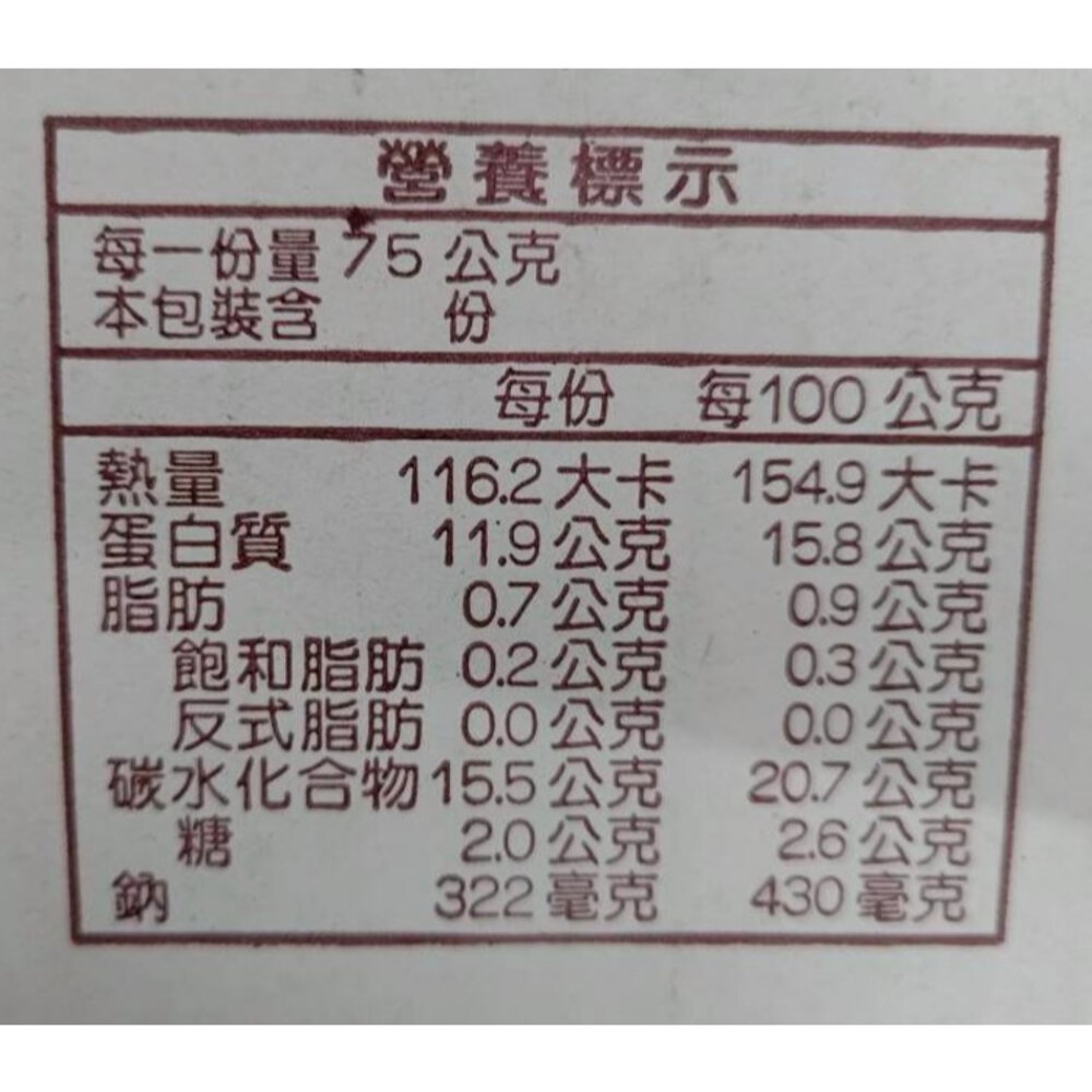 成分:虱目魚肉、水、麵包油炸粉{麵粉【小麥、L-抗壞血酸(抗氧化劑)】、水、精製棕櫚油【棕櫚油、香料、混合濃縮生育醇(抗氧化劑)】、鹽、酵母、玉米澱粉、硫酸鈣、碳酸氫銨製劑(碳酸氫銨、碳酸鎂)、L-抗壞血酸(抗氧化劑)、酵母抽出物、食用黃色四號、食用黃色五號、精製椰子油}、調合油【棕櫚油、大豆沙拉油、芥花油、消泡劑(矽樹脂)】、酥漿粉【黏稠劑(磷酸二澱粉、玉米澱粉、黏稠劑(乙醯化己二酸二澱粉)、大豆油】、炸酥粉【麵粉、黏稠劑(磷酸二澱粉)、蛋白粉、食鹽】、洋蔥、分離大豆蛋白(非基因改造黃豆)、蔗糖、蒜、米霖(糯米、米麴、果糖、水、釀造醋、食鹽)、食鹽、小麥纖維、調味劑(L-麩酸鈉)、洋蔥粉、蒜粉(大蒜粉、麥芽糊精、辣椒、大蒜萃取物)、白胡椒粉、結著劑(焦磷酸鈉、多磷酸鈉)、黑胡椒粉、調味劑(5'-次黃嘌呤核苷磷酸二鈉、5'-鳥嘌呤核苷磷酸二鈉)