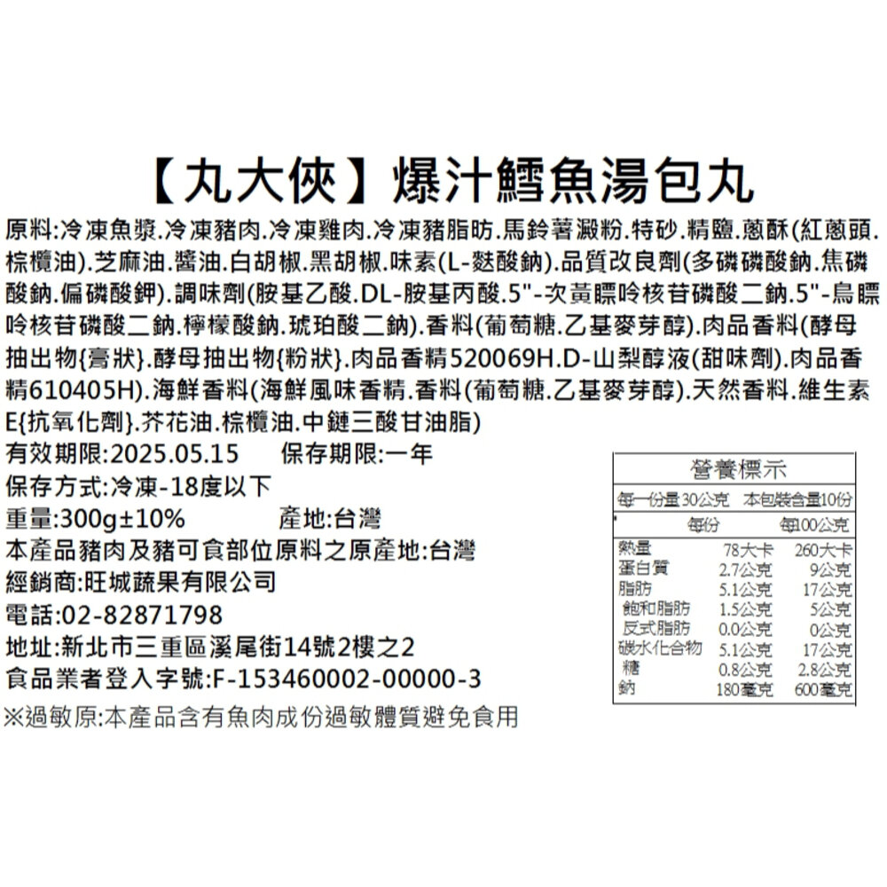 陳家鴨肉丸 ★外皮Q彈肉餡多,鮮嫩爆汁的口感 ★必敗團購精選美食,網路超人氣 ★煎炒煮拌烤,樣樣都行 品名:陳家鱈魚湯包貢丸 重量:300g±10%/包(12-14顆) 產地:台灣 主原料:冷凍魚漿、冷凍豬肉、冷凍豬油 不適用鑑賞期規範因 商品屬於易於腐敗商品,依通訊交易解除權合理例外情事適用準則第2條第1款規定,不適用消費者保護法第19條之適用。因商品因消費者保存方式不當導致腐敗,基於食品安全,亦同