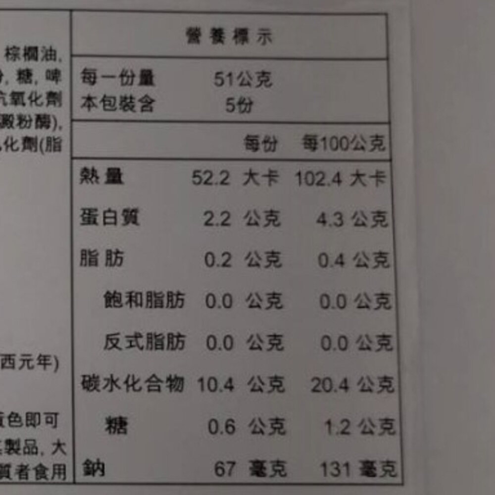 成分:白蝦、麵粉、蔗糖、玉米粉、食鹽、棕櫚油、樹薯澱粉、醋酸澱粉、磷酸二澱粉、糖、啤酒酵母、著色劑(β-胡蘿蔔素)、抗氧化劑(維生素C)、品質改良劑(碳酸鈣、澱粉酶)、調味劑(L-麩酸鈉)、關華豆膠、乳化劑(脂肪酸甘油酯)